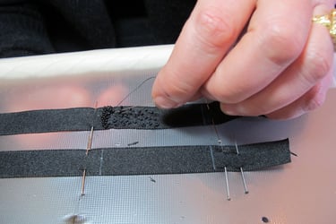 Argent 925, galuchat noir, ruban soi brodé points divers et billes anciennes.