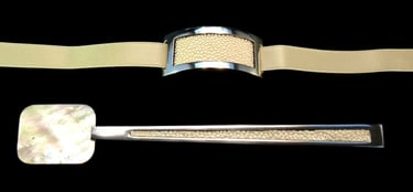 Caviar spoon and napkin ring Mademoiselle Argent Nude. Silver 925, South Pacific gold mother of pearl, nude shagreen, nude satin ribbon.