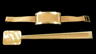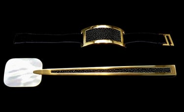 Cucchiaio caviale e portatovagliolo Mademoiselle Noir Or. Oro 18k, madreperla bianca, galuchat nero, nastro di velluto nero.