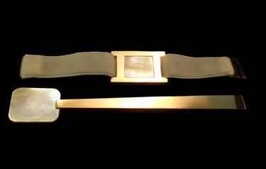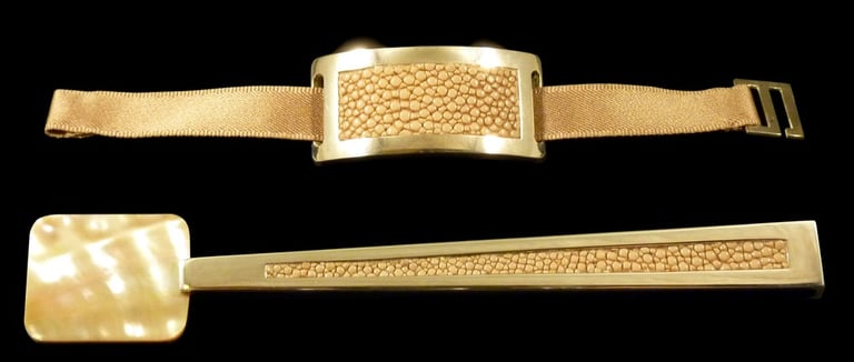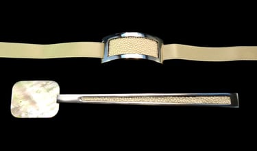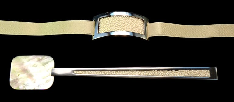 Cucchiaio caviale e portatovagliolo Mademoiselle Argent Nude. Argento 925, madreperla gold Pacifico Sud, galuchat nude, nastro raso nude.