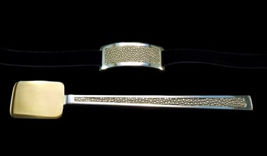 Cucchiaio caviale e portatovagliolo H Métal. Argento 925, e vermeil, nastro raso nero.