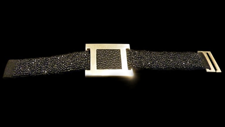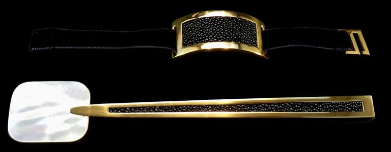 Argento 925, galuchat nero, nastro nero di seta ricamato.