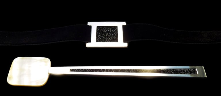 Cucchiaio caviale e portatovagliolo Mademoiselle Argent Noir. Argento 925, madreperla bianca, galuchat nero, nastro velutto nero.